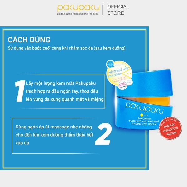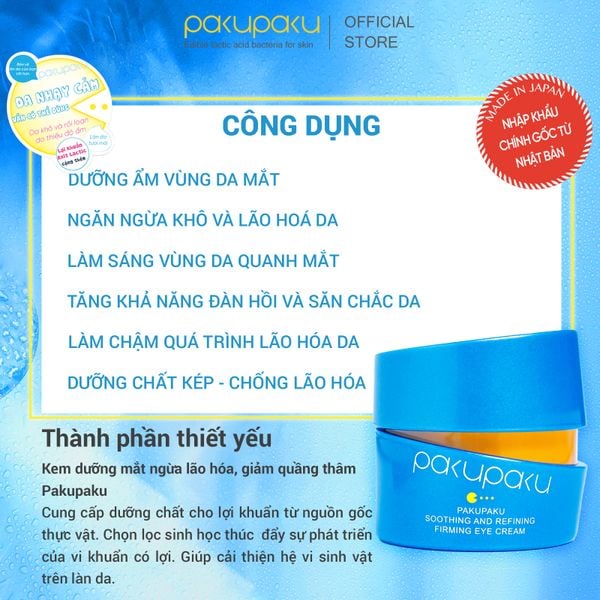 Kem dưỡng mắt ngừa lão hóa, giảm quầng thâm Pakupaku Soothing And Refining Firming Eye Cream 15g có công dụng dưỡng ẩm vùng da mắt, ngăn ngừa khô và lão hoá da đồng thời làm sáng vùng da quanh mắt, tăng khả năng đàn hồi và săn chắc da.